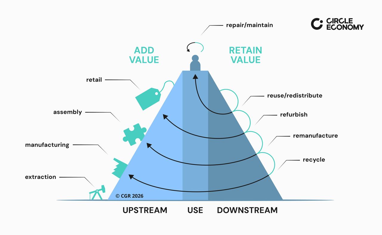 The environmental impacts of this model are significant. Resource use has tripled since 1970, and more than half of global greenhouse gas emissions, most biodiversity loss, and water stress stem from the extraction and processing of materials. [1] Human-made materials now outweigh all living biomass. [2] Yet this surge in material consumption is no longer delivering an increasing return. Global resource productivity—the economic output generated per unit of material used—has effectively stalled over the past decade. [3] Businesses and economies are consuming more material inputs without real efficiency gains. With this in mind, the circular economy is not only a key approach to help reduce ecological pressures but also represents a significant economic opportunity. The Circularity Gap Report (CGR®) 2026 shifts the lens from environmental indicators to an economic perspective by asking a fundamental question: What is the extent of avoidable value lost through linear and inefficient economic practices?