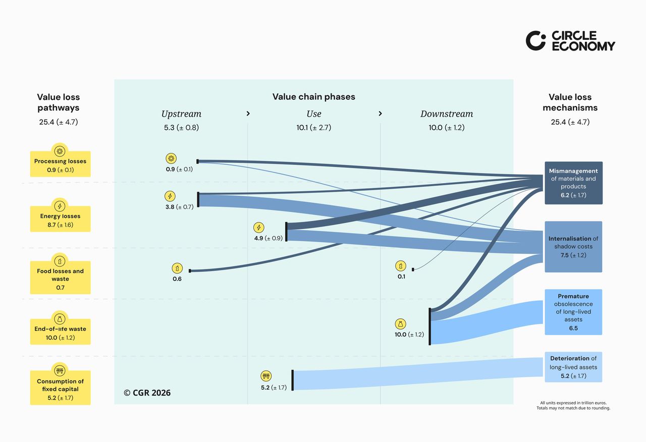 The initial estimate of €25.4 trillion (± €4.7 trillion) in total value loss can be interpreted through three complementary lenses: value loss pathways, value loss mechanisms, and value chain stages (Figure two). First, value loss can be viewed as the aggregate of five pathways that structure losses along physical and monetary flows, as discussed in detail in The Value Gap. Second, it can be understood through the mechanisms by which it occurs. That is, the underlying processes that drive inefficiencies and value destruction. Third, value loss can be examined from a value-chain stage perspective to show where, along the lifecycle of materials and products, value losses predominantly arise.