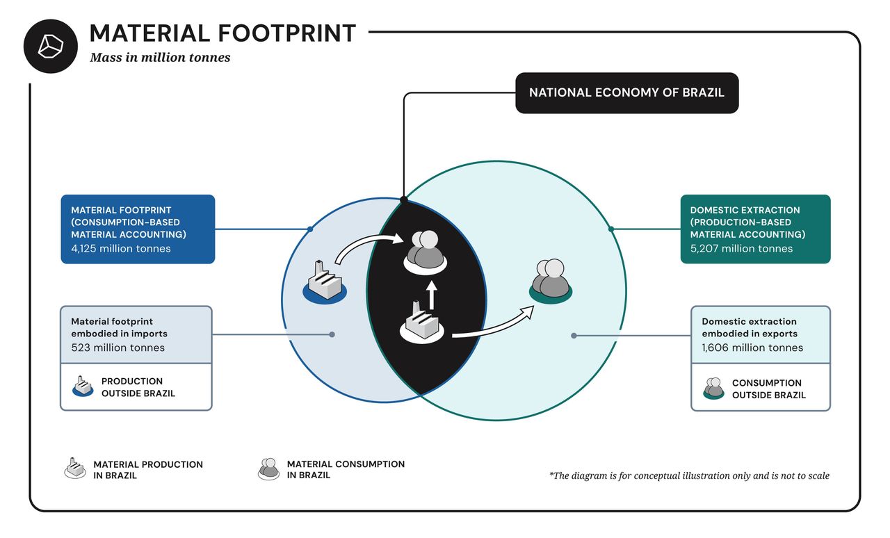 The material footprint is a widely used consumption-based indicator that captures the total amount of raw materials embodied across the entire supply chain to meet an economy’s final demand for goods and services. It provides a comprehensive view of consumption patterns—regardless of where resource extraction, processing or disposal occurs. To better understand Brazil’s role in global material flows, we also consider the production-based perspective.