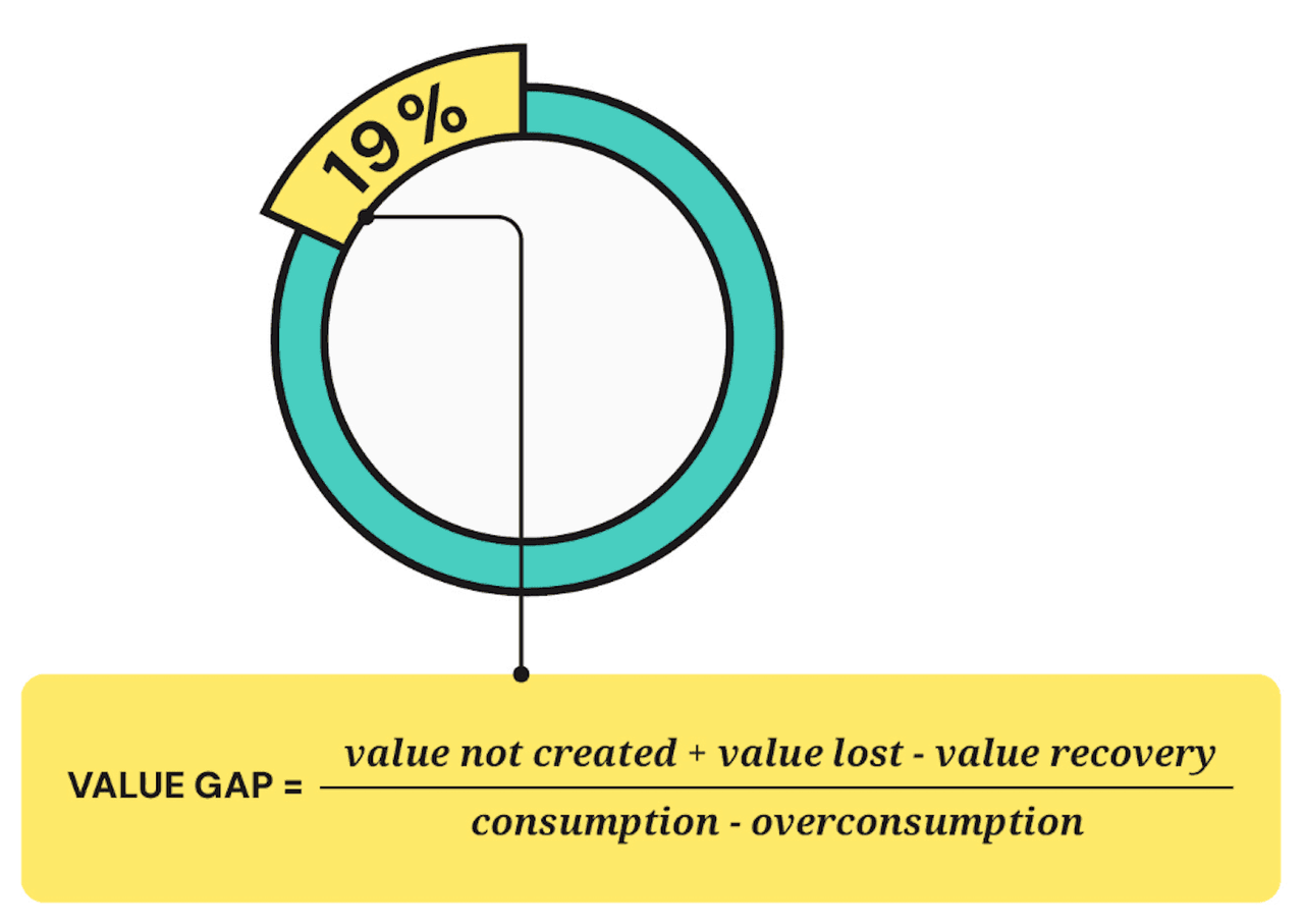 We calculate the Value Gap by summing all value that is lost or never created, then subtracting the value recovered at end-of-life through waste management. This figure is divided by the total value society actually captures, excluding overconsumption (see Figure two). A lower Value Gap signals that more value is retained through design, efficient systems, and circular strategies, while a higher Value Gap exposes systemic inefficiencies, waste, and lost opportunities for value creation.