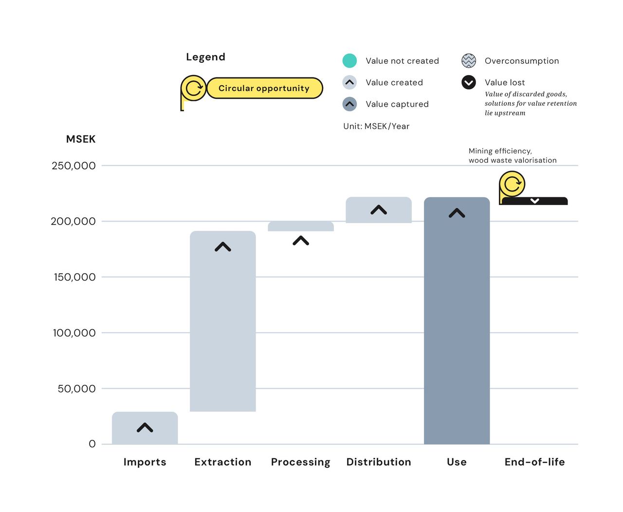 As shown in Figure four, Sweden’s Mining & Extraction sector generates approximately SEK 220 billion in consumption value. Of this, an estimated SEK 6 billion—or 3%—is lost at end-of-life, primarily through metals left behind in tailings.