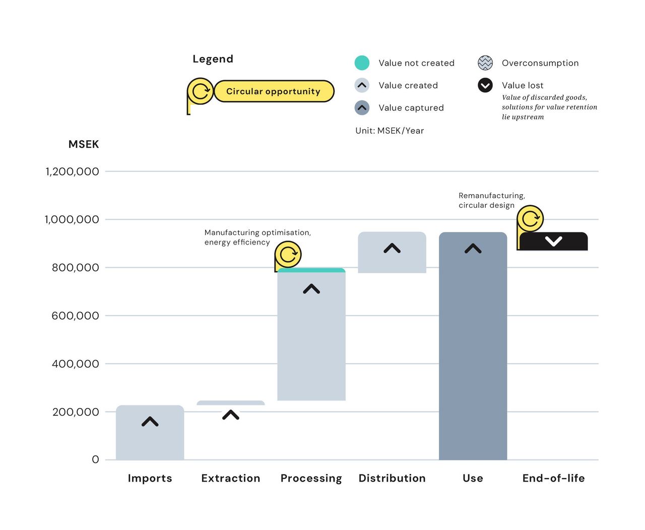 As shown in Figure five, Sweden’s Manufacturing sector generates around SEK 954 billion in consumption value. Yet 9% of this is lost or never created due to linear and inefficient practices, these losses represent both materials and energy lost in the process.